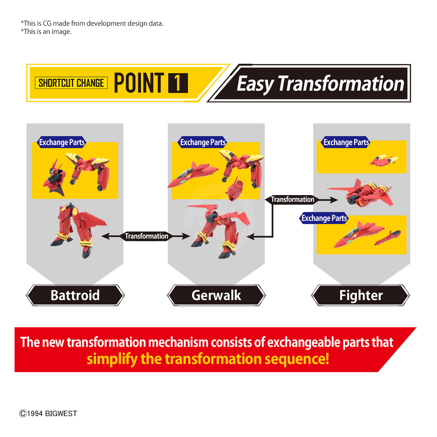 - With the inclusion of interchangeable parts, the transformation between Battroid, Gerwalk, and Fighter modes is simplified and streamlined.